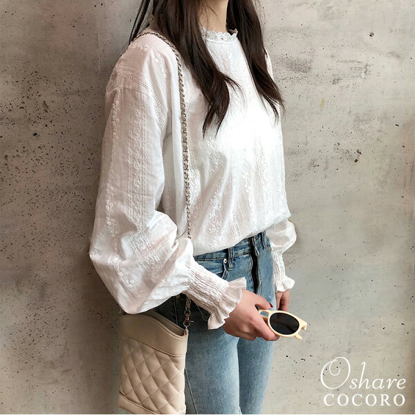【S-SALE】【ネコポスOK】ボリュームスリーブ ブラウス レディース 袖コンシャス おしゃれ トレンド 長袖 トップス レース コットン 綿 20代 30代 40代 50代 大きいサイズ S M L XL