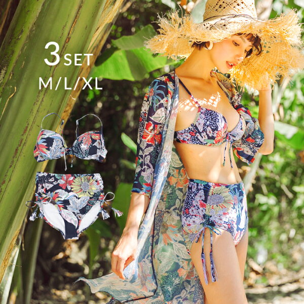 【楽天スーパーSALE 半額】水着 体型カバー レディース ビキニ オトナ女子 ガウン 羽織 カバーアップ付き 3点セット ボタニカル 柄水着 トレンド 通販 ワイヤー入り パッド入り ママ水着 大人 女性